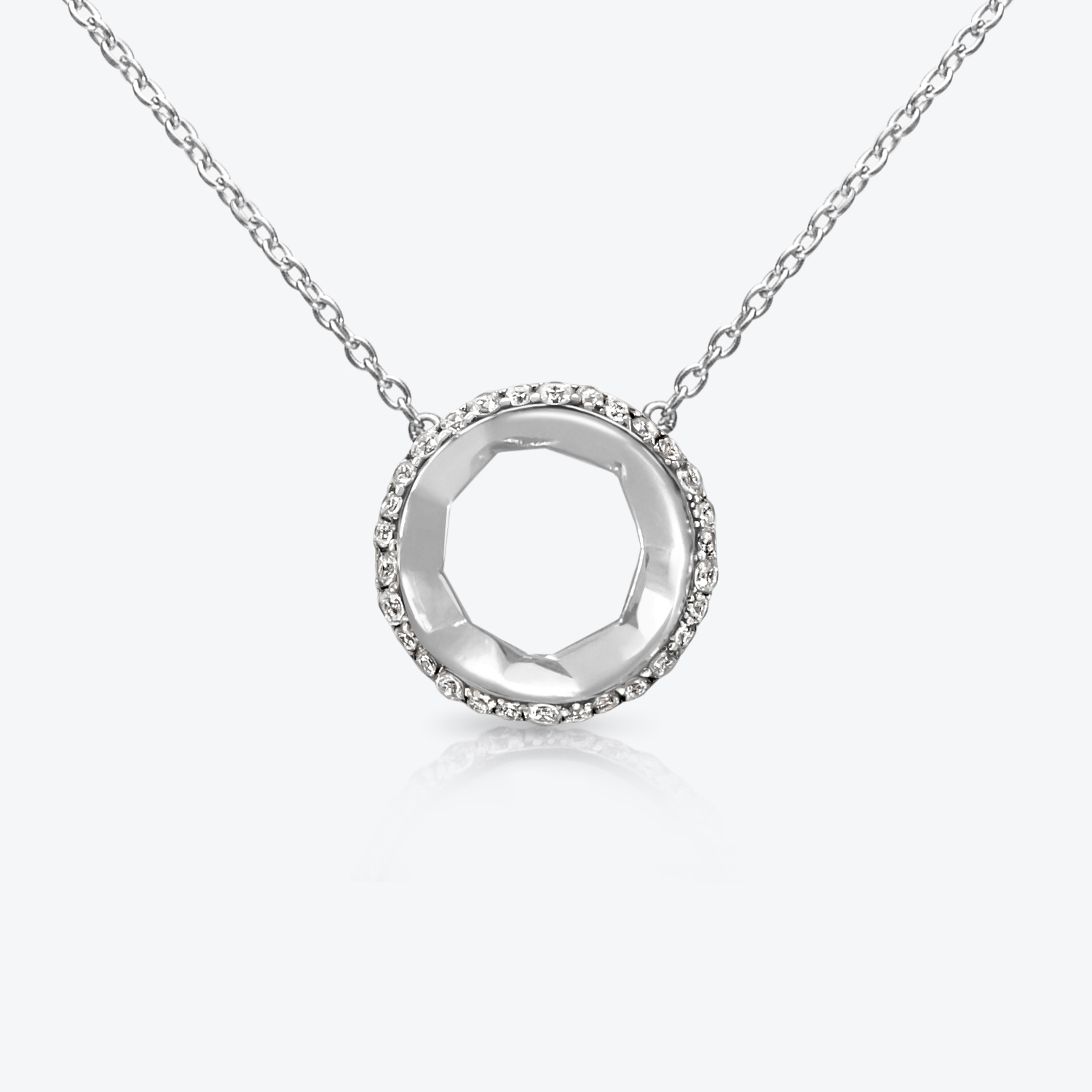 Open circle pendant necklace in 18kt white gold with an outer pave of 30 sustainable, brilliant cut diamonds.