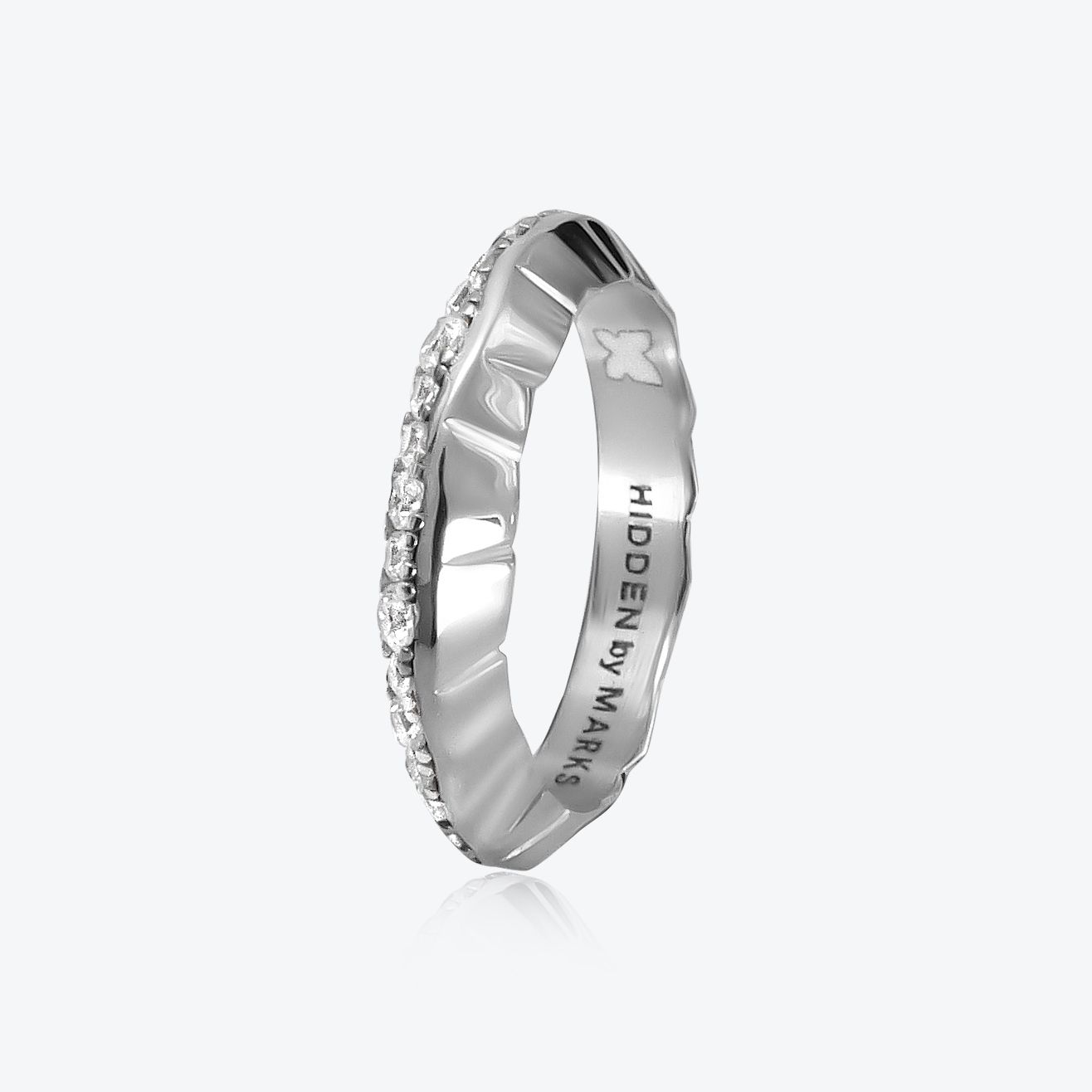 Facet cut 18kt white gold ring with lab grown diamond pave.