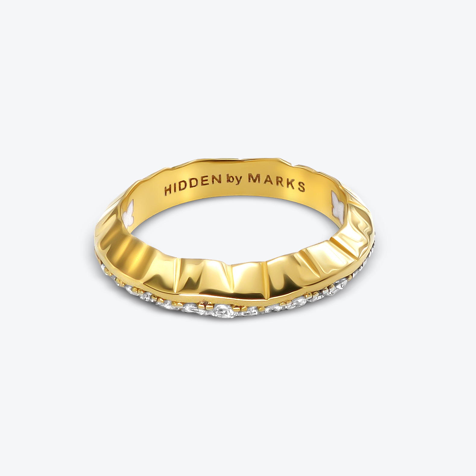 Faceted 18kt gold ring with pave of brilliant cut lab grown diamonds.